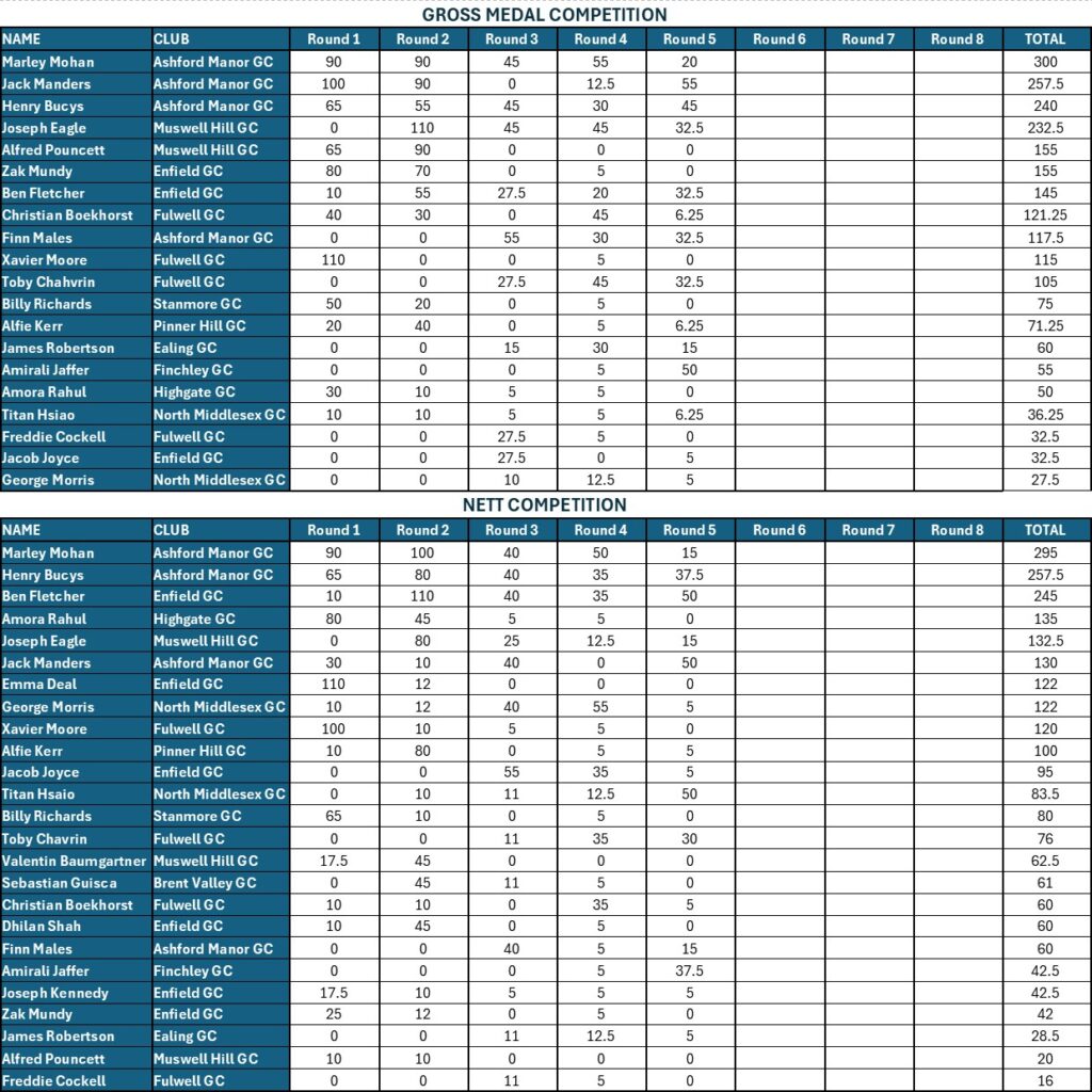 JUNIOR FUTURES TOUR LEAGUE TABLES after ROUND 5